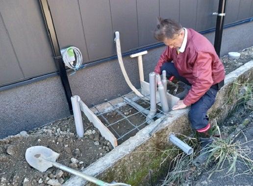 水道屋さんは、エコキュートの設置工事中です。貯湯タンクユニットの満水時には、かなりの総重量になるので、しっかりとした土台が必要になります。
