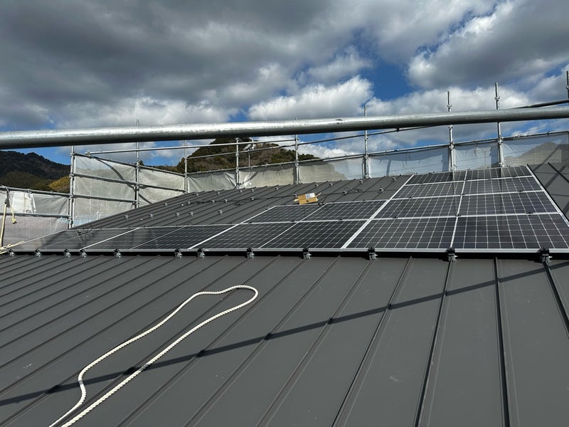 外部ではソーラーパネルの施工を行なっています。陽当たりも良く、たくさん発電してくれそうです!この後は外壁材を貼るための下地(胴縁)の施工へと進んでいく予定です。今後の進捗も楽しみにしていてください!