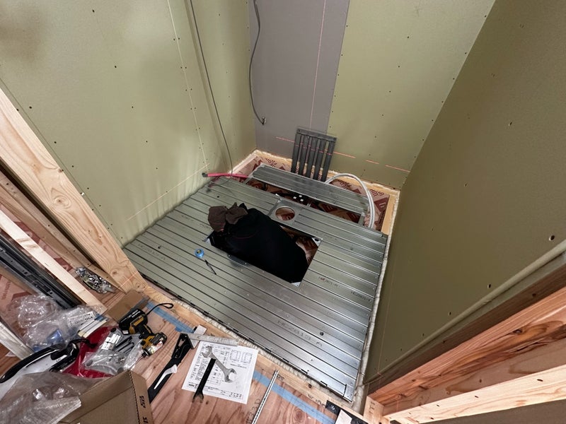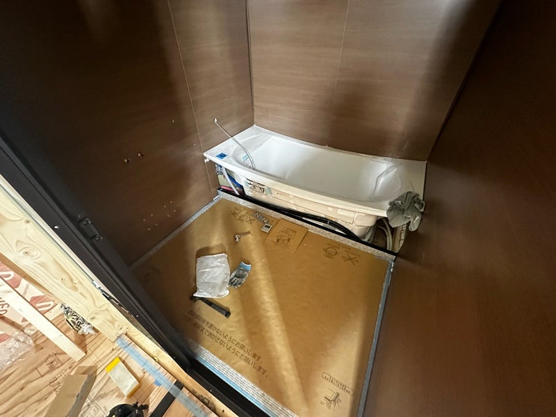 今週はユニットバスの取り付けを行いました。パネル等を搬入して現場で組み立てています。