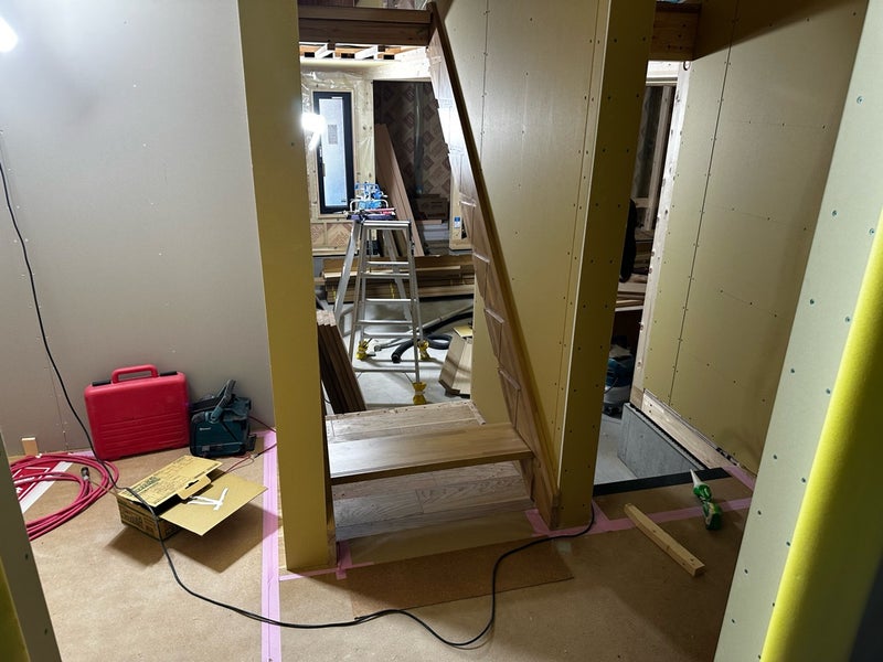 木工事は階段の取り付けまで完了しました。ナラの階段材を床フローリングの色に合わせて塗装しています。今まではハシゴで昇り降りしていましたが安全に移動出来るようになりました。次回の現場でのお打ち合わせが楽しみです!