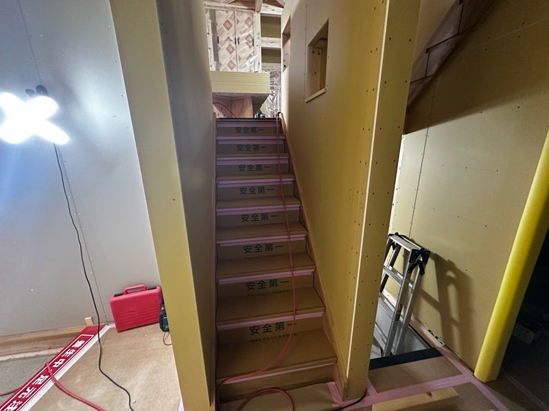 階段取り付け後は2階の壁のボード貼りを行なっています。ビスの打ち込み深さや間隔を気をつけながら作業しています。ボードが全て貼り終えた段階でボードの監査を実施します。しっかりとチェックを行うので安心してください!