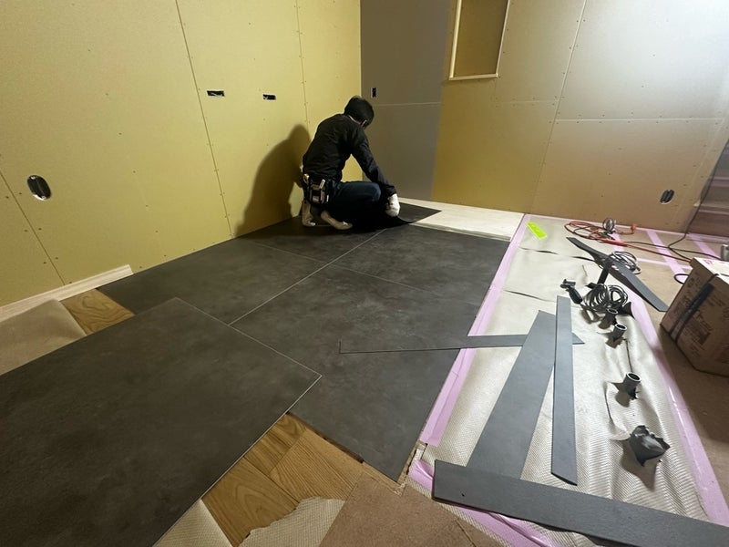 キッチンのフロアタイルは90センチ角の大判のタイルを貼っています。タイルが一番よく見える割り付けを考えて丁寧に施工してもらっています。大判タイルは高級感があって良い感じです。来週にはキッチン本体の据え付け工事もあるので合わせて見てもらうのが楽しみです!