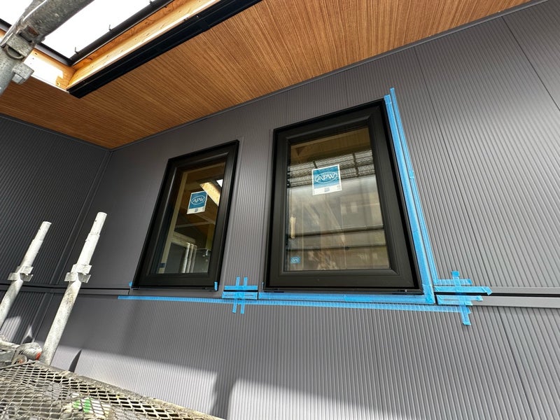 外部ではコーキングの工事を行なっています。外壁材の役物との取り合いや窓周りなどにコーキングを打って防水性を高めています。来週末には外部の工事が全て終わる予定です。足場の撤去までもう少しです。外観全体が見られるのを楽しみにお待ちください!