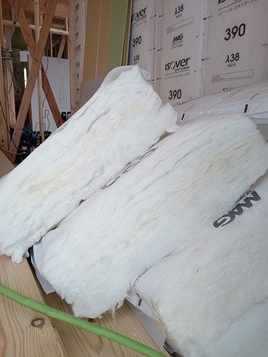 この上に石膏ボードを貼っていくのですが、断熱材が厚いのでボードを押しながらビスを打っていくのが意外と大変です。(棟梁談)