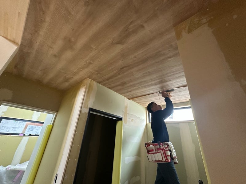 内部ではクロス工事が順調に進んでいます。天井がほぼ貼り終わり、壁のクロスを貼り進めています。クロス工事はあと一週間ほどで終わる予定です。完成が近づいてきました!K様楽しみにお待ち下さい!