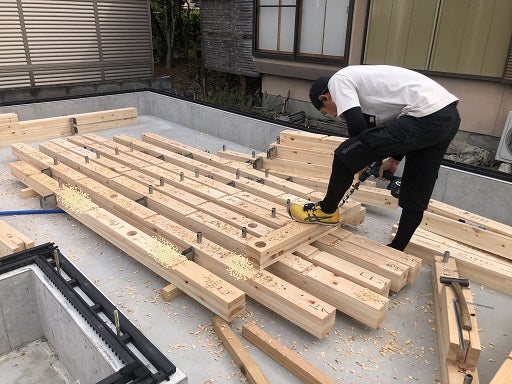 最後に床の構造用合板を指定の釘及び間隔で留めつけて作業完了です。