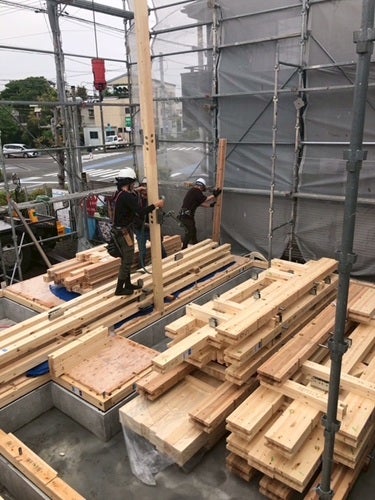 作業開始。1階の柱から決められた場所に決められた柱を建てていきます。