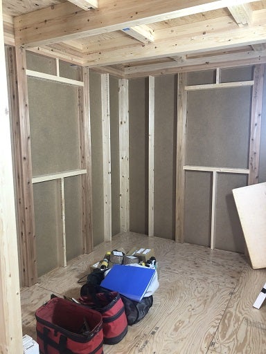 上棟後、工事は順調に進んでいます。外部の耐力面材の仮打ちが終了し棟梁は間柱や窓台、まぐさ等の下地の取付作業を進めています。