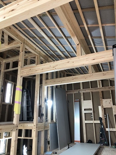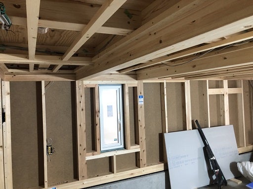 下地の間隔やボード継ぎ手部分の下地の確認、シーリングファンやペンダント照明の下地も入れていきます。2階部分が終わり現在1階部分の施工を進めています。