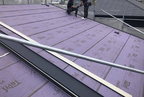 外部では透湿防水紙貼りが終了し通気胴縁の取付工事を進めていきます。並行して屋根工事も進めました。