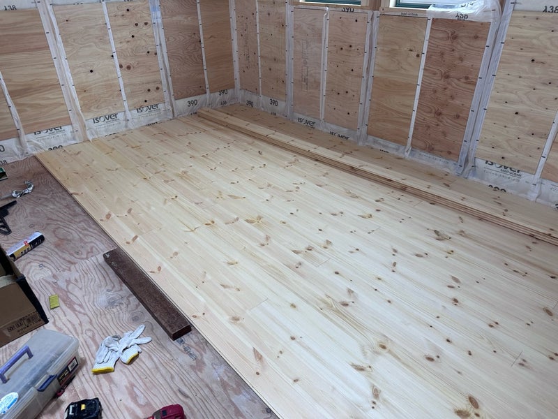 こんにちは!鎌田です。葵区のC様邸です。天井の石膏ボード貼りが終わり床フローリングの施工を進めています。