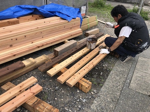ウッドバルコニーの部材も現場に入り、並行して塗装工事も進めています。足場撤去後、バルコニーの施工も行う予定です。こちらも楽しみです。