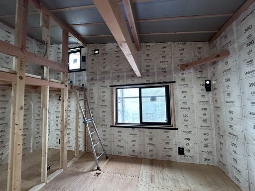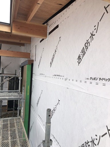 桁・母屋廻りにはストレッチガードテープにて止水処理をしています。シートは縦及び横方向の規定以上の重ね合わせ長さを確保し丁寧に張っていきます。この後外壁下地である通気胴縁の施工に取り掛かります。