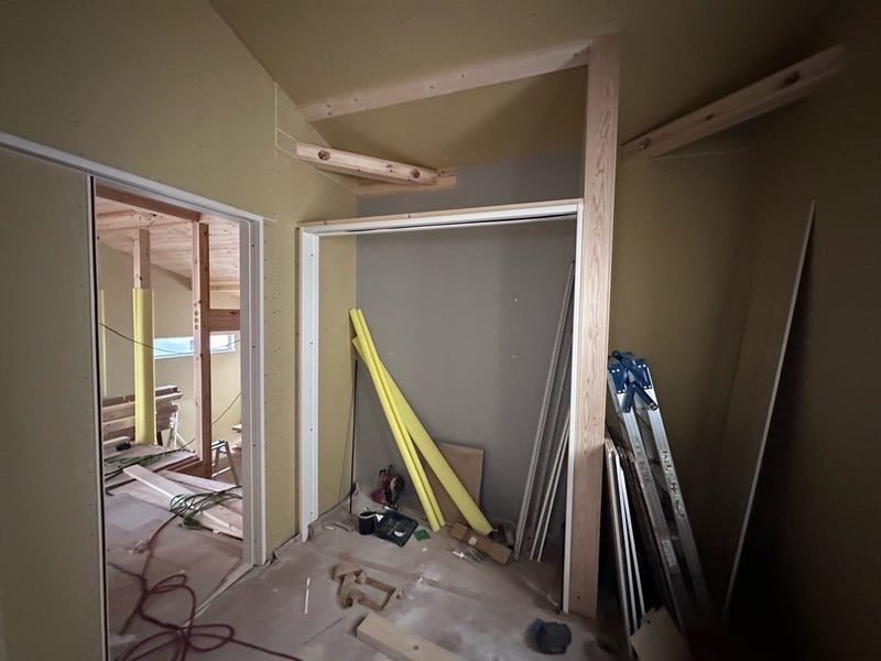 先週に引き続き、壁のボード貼りと建具枠の取り付けを進めています。2階の方から作業を進めていて、来週末くらいには2階のボード貼りは終わりそうです。