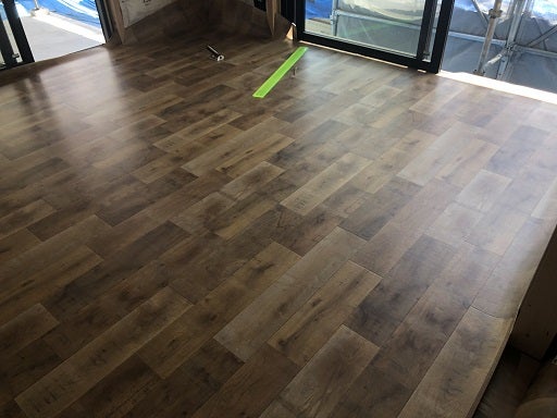 一面に床が貼られました。とてもかっこいいです。床貼り終了後棟梁は窓枠の取付を進め、