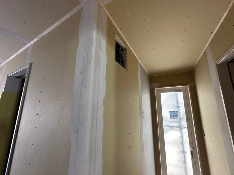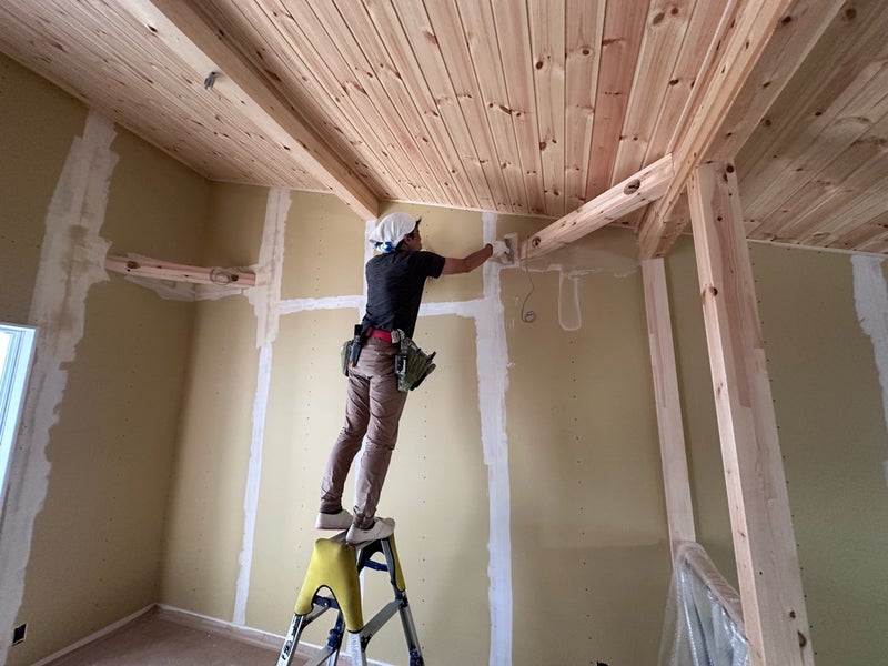 今週は下地のパテ処理を行なっています。ボードの繋ぎ目やビスの穴にパテを埋めて平らにしていきます。仕上がりに関わる重要な作業なので2日かけて入念に行います。パテ処理が終わり次第、壁紙を貼っていきます!