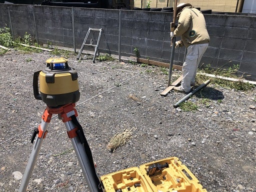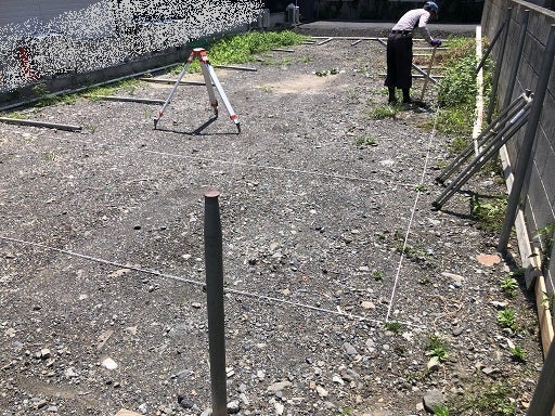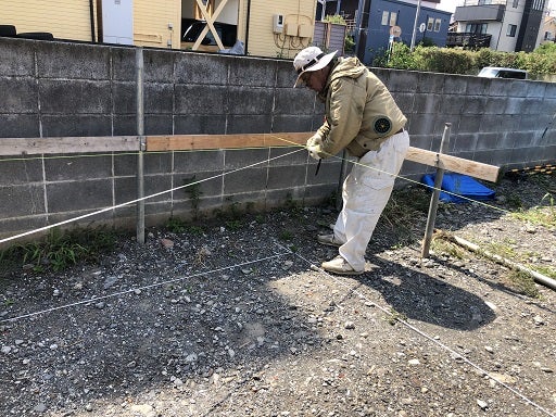 あらかじめ張られた地縄の位置を参考にして建物の周囲に杭を打っていきます。