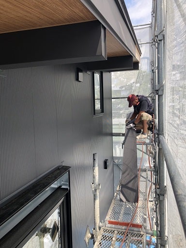 外部では外壁のシーリング工事終了後、電気設備の取り付けや破風鼻隠しなどの板金工事