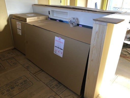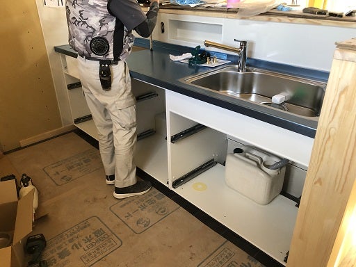 まずは、キッチンパネルの位置や換気扇の位置だしをし、施工を進めます。