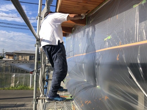外部では、シーリング工事が終了し軒裏の塗装工事を進めています。