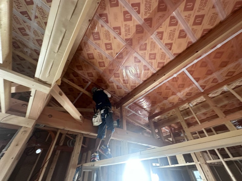 内部では大工さんが屋根断熱を進めています。断熱材の下に防湿シートを貼って気密性を高めています。この後は壁の断熱材と防湿シートを施工し、1回目の機密検査へと進んでいきます。今後の進捗も楽しみにしていてください!