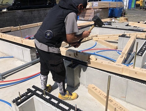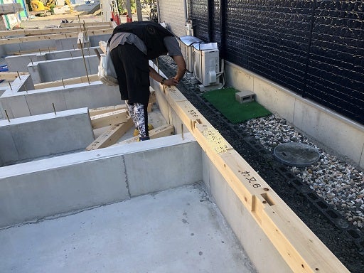 基礎工事終了後、上棟前の準備として棟梁が現場に入り土台を据える工事を行いました。