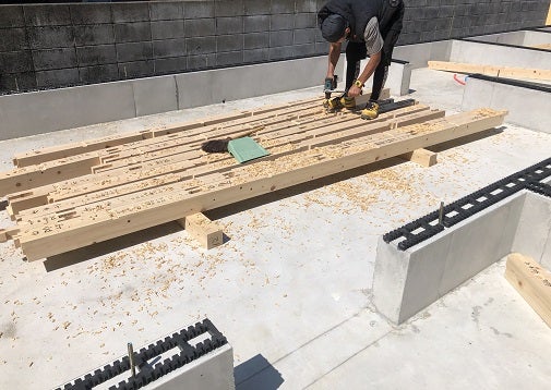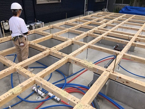 基礎の上に出した基準の墨にあわせてアンカーボルトにて強固に緊結します。大引きの施工まで完了したところで第三者の現場監査を受けました。