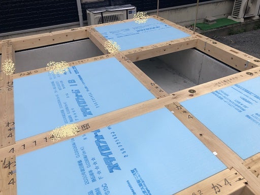 印しをし終わった箇所から並行して床下換気部材として基礎パッキンを敷きならべていきます。