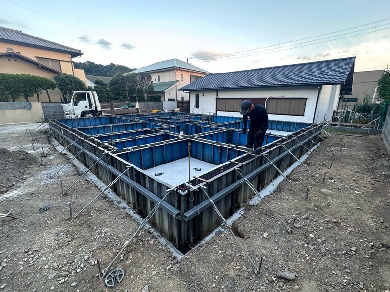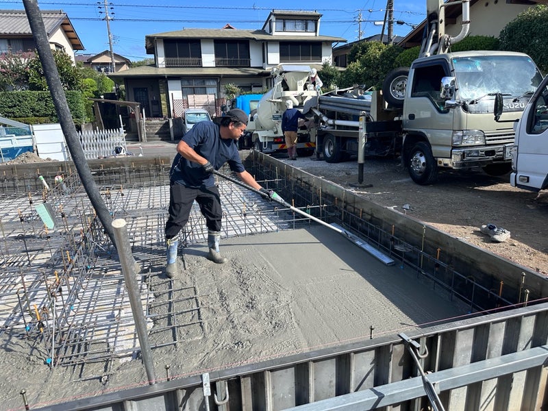 こんにちは!鎌田です。駿河区のO様邸です。今週スラブのコンクリート打設、立ち上がり部の型枠設置を行いました。