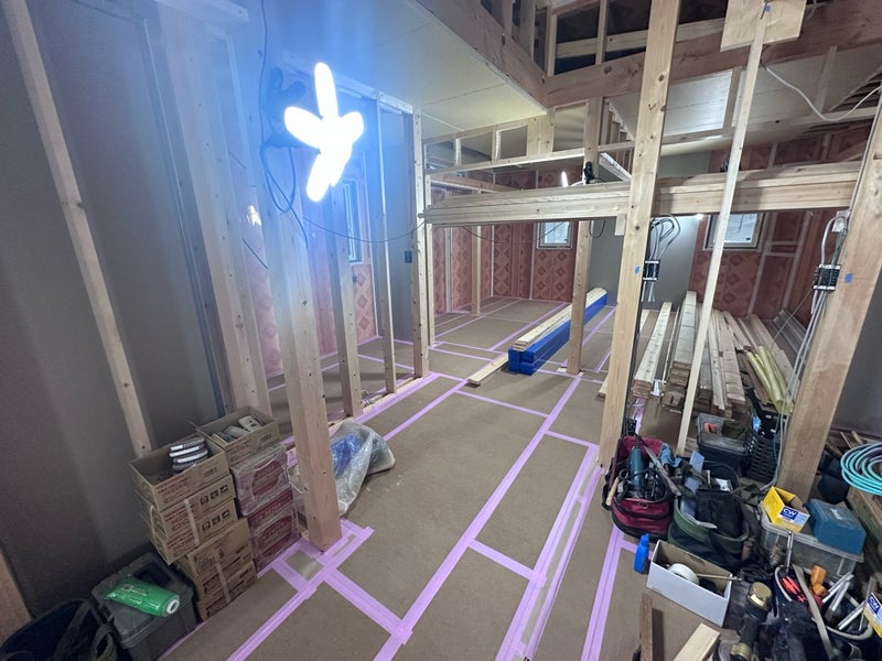 先週から引き続きフローリングの施工を進めています。1階の床が貼り終わりこれから2階の床を貼っていきます。 床が貼り終えたら壁のボード施工や建具枠の取り付けに進んでいきます。
