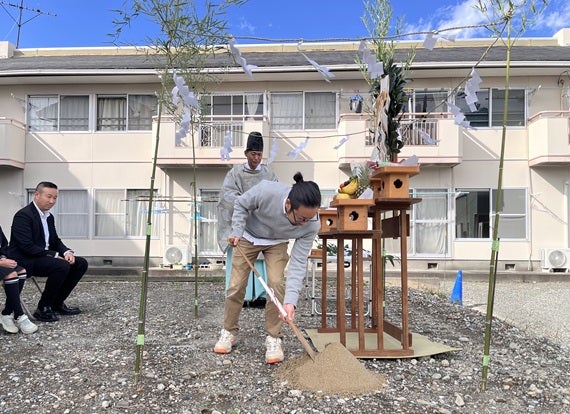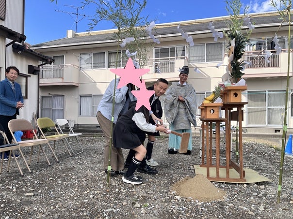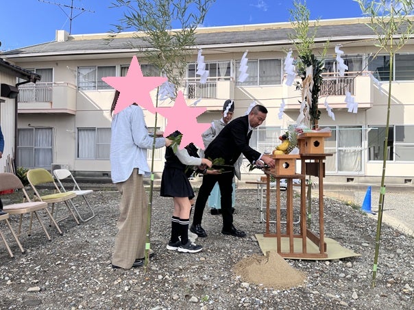 建築予定地の厄払いを行います。次に、お施主様ご一家による鍬入れの儀。こちらを向いて、はいチーズ