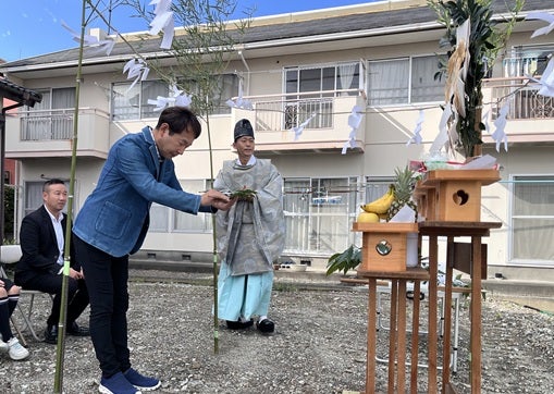 「エイッ」と小気味よい声!慣れたものです。続いて「玉串奉奠(たまぐしほうてん)」。工事の無事安全を祈ります。