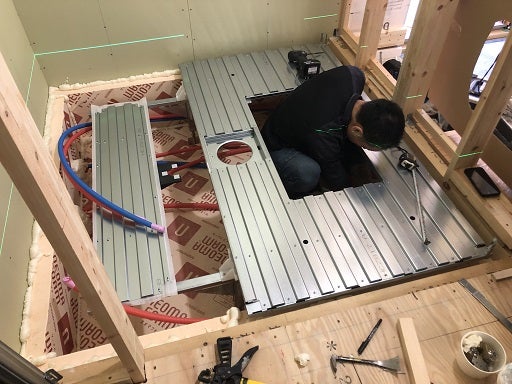 施工前に基礎断熱材の施工状況と気密処理を再度確認し組み立て開始です。まずは床から組んでいき夕方には完成しました。