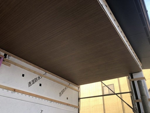 外部は防水下地検査合格後、軒天の施工を進めました。