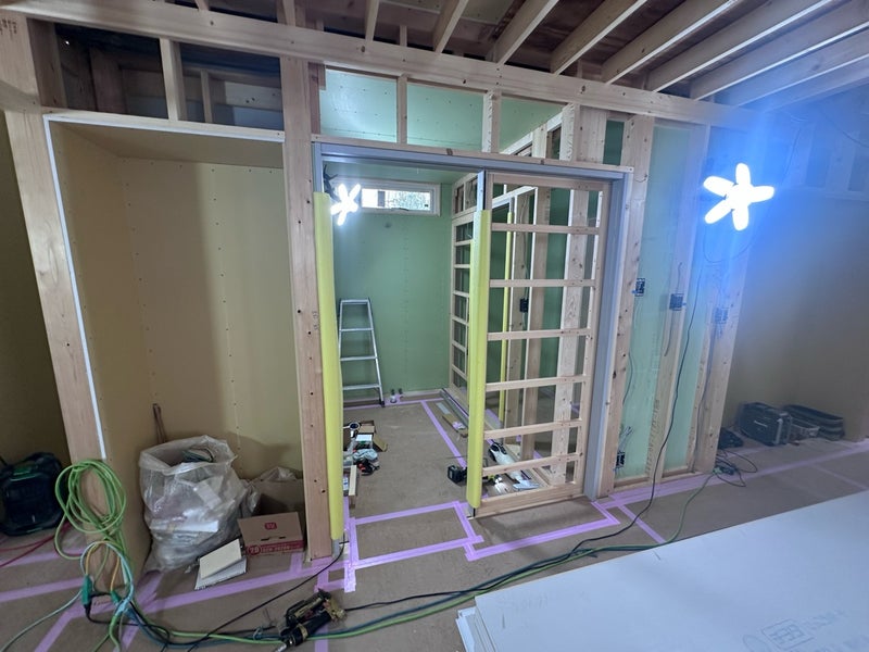 今週も壁のボード施工をしつつ、建具枠の取り付けを行っています。部屋に合わせて枠の色を変えたりしているので取り付け箇所をしっかりと確認して取り付けしていきます。扉本体の吊り込みは大工さんの工事が終わる直前頃になります。