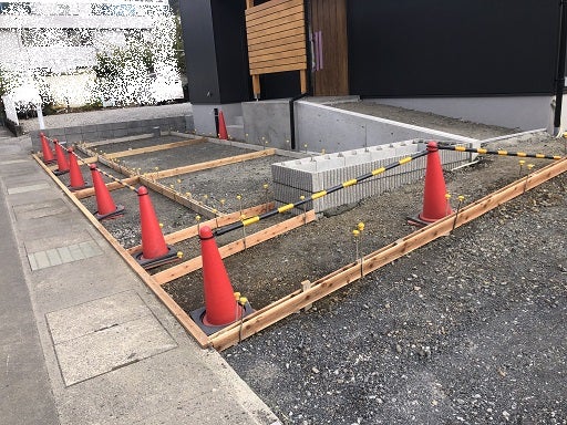 ポーチへのアプローチの階段の作成も終わりスロープ部分と駐車場の土間工事を進めていきます。