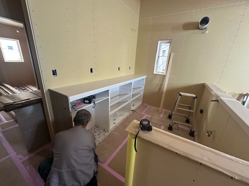 床の施工が終わったのでキッチンと背面収納と取り付けです。キッチン以外の水回り設備はクロス工事完了後に取り付けします。