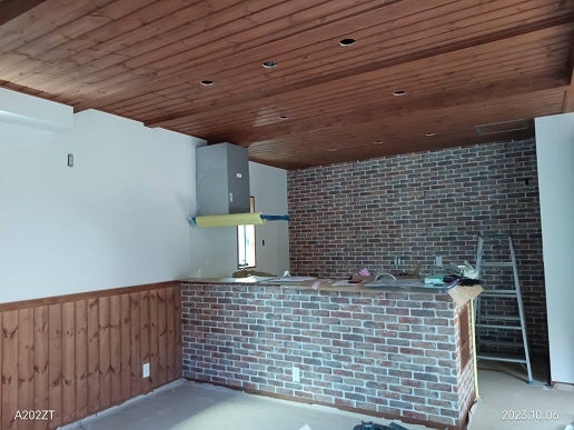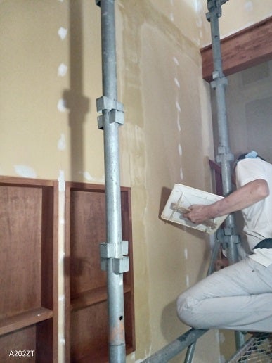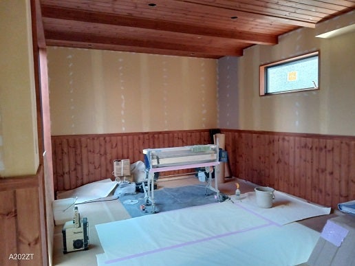 壁や天井にクロス(壁紙)を貼るクロス工事中です。