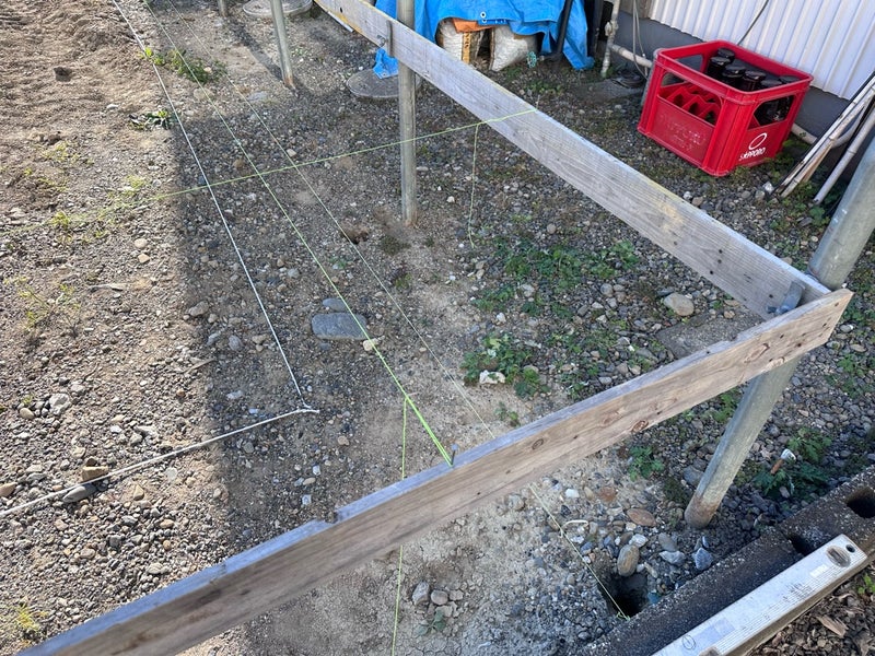 トランシットという測量器で正確に直角を出して水糸を張って遣り方完了です。この後は地面を掘って行く作業に進んでいきます。