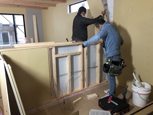 キッチンの施工を来週に控えキッチン前の腰壁の施工を進めました。配管の位置、電気配線の位置、キッチンの収まりを再度確認し進めていき、