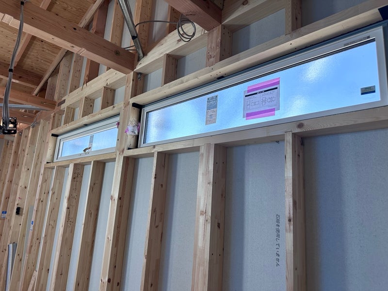 LDK以外の部屋のサッシの取り付けが完了しました。サッシ取り付け後には四方に発泡ウレタンを吹いて気密と断熱の対策を行います。