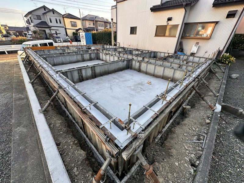 生コン打設が終わったらしばらく養生期間に入ります。強度が出るまでしっかりと養生し、来週には型枠を撤去する予定です。型枠撤去後はポーチの階段施工を行います。基礎完成までもう少しです。楽しみにしていてください!