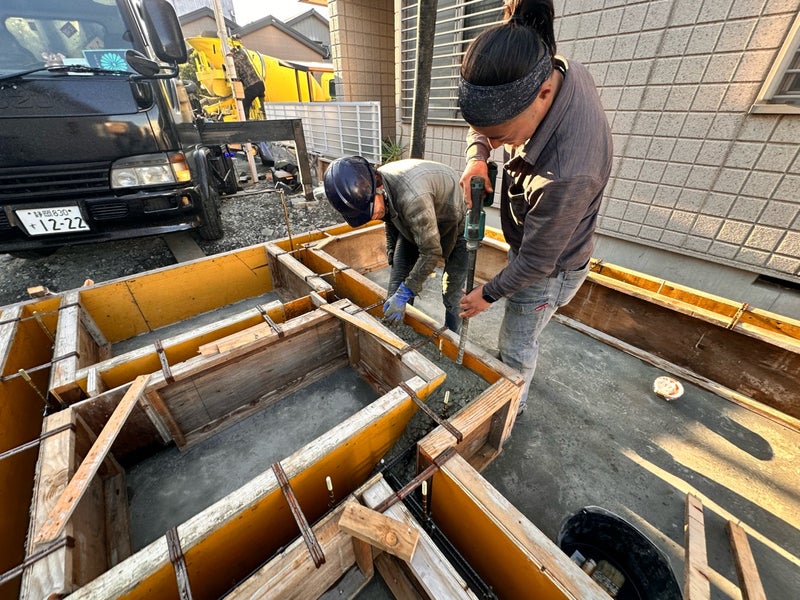 生コンをポンプ車で圧送して型枠内に流し込んでいきます。同時に振動機を使って型枠の隅々まで生コンが行き渡るようにしています。生コン打設後は十分に養生期間をとって型枠の撤去を行なっていきます。基礎が完成したら給排水管の施工、土台据えへと進んでいきます。O様楽しみにしていてください!