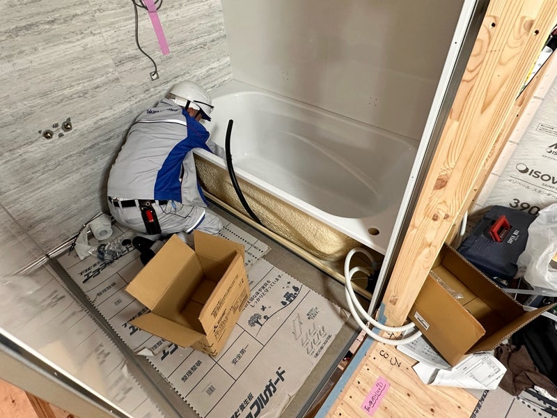 ユニットバスの施工も行なっています。2階の設置なので架台を設けてその上にユニットバスが乗るような仕組みになっています。次のお打ち合わせの時には出来上がったお風呂を見ていただけると思います。O様楽しみにしていてください!