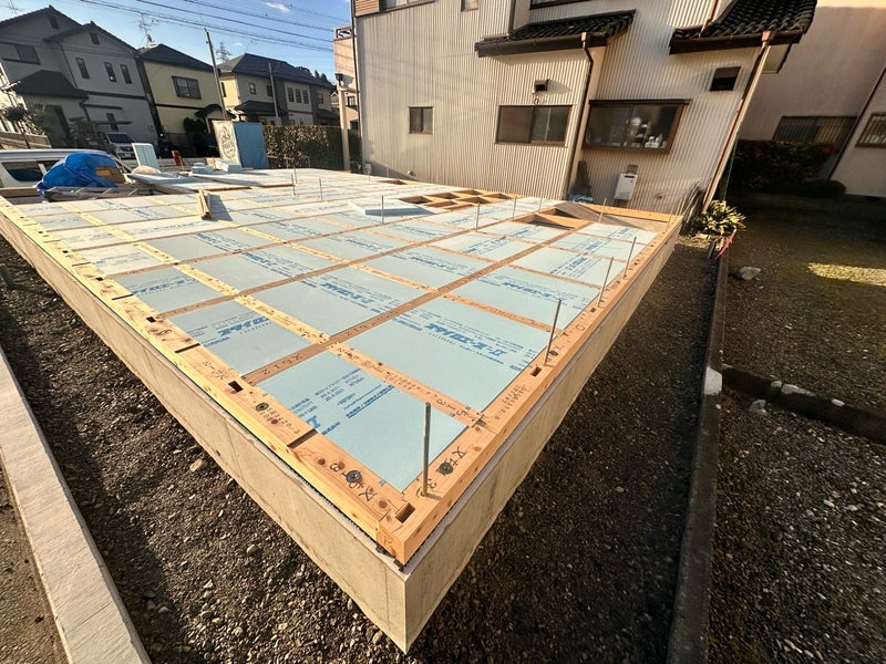 床合板を敷いて釘で固定、最後に汚れ防止のシートとブルーシートで養生をして土台伏せ完了です。この後は上棟用の材料搬入、足場設置をして上棟となります。上棟日までもう少しです。I様楽しみにしていてくださいね!