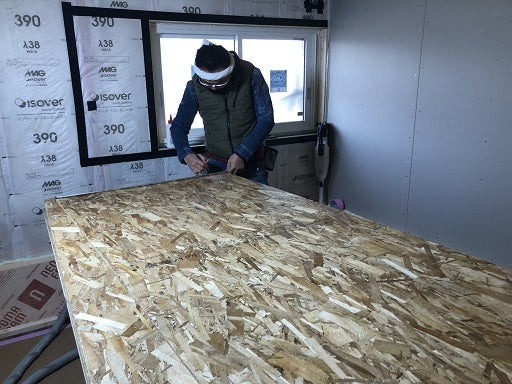 間仕切り壁が出来上がり、更に部屋の空間がわかりやすくなりました。引続き棟梁はアウトドアストッカーの天井のOSBパネルの施工を進めています。