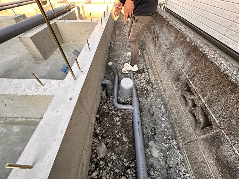外部には雨水と屋内から出る雑排水の配管が通っています。。排水勾配が取れているか水平器で逐一確認しながら施工しています。