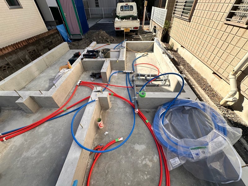 こんにちは!鎌田です。葵区のO様邸です。基礎工事が完了し、給排水管の施工を行いました。