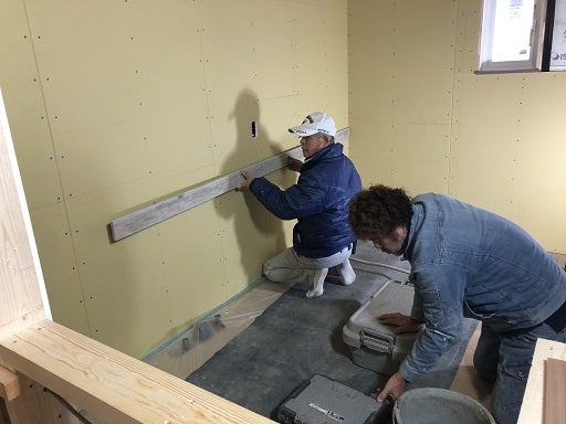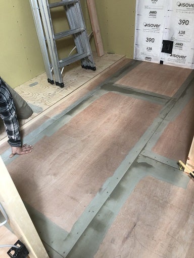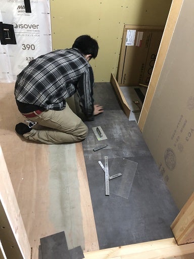内部も外部も工事は順調に進んでいます。内部ではキッチンの施工準備として床のフロアタイル張りを進めました。