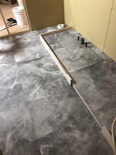 そして割り付けを考慮して一枚一枚張っていきます。とてもいい感じです。1階部分の洗面所やトイレ、ランドリー室も完了しています。
